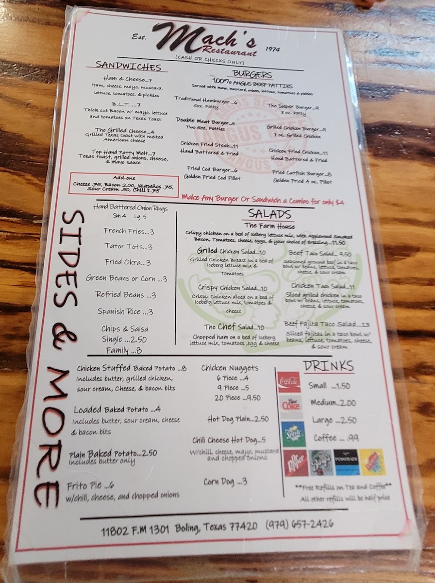 Welcome to Mach's Restaurant, a cherished gem in Boling-Iago, Texas, where culinary delights await. This inviting eatery serves a diverse menu that celebrates the heart of Tex-Mex cuisine. The recognizable sandwiches, from the classic Ham & Cheese to the Top Hand Patty Melt, are perfectly complemented by hearty sides like Fried Okra and Tator Tots.